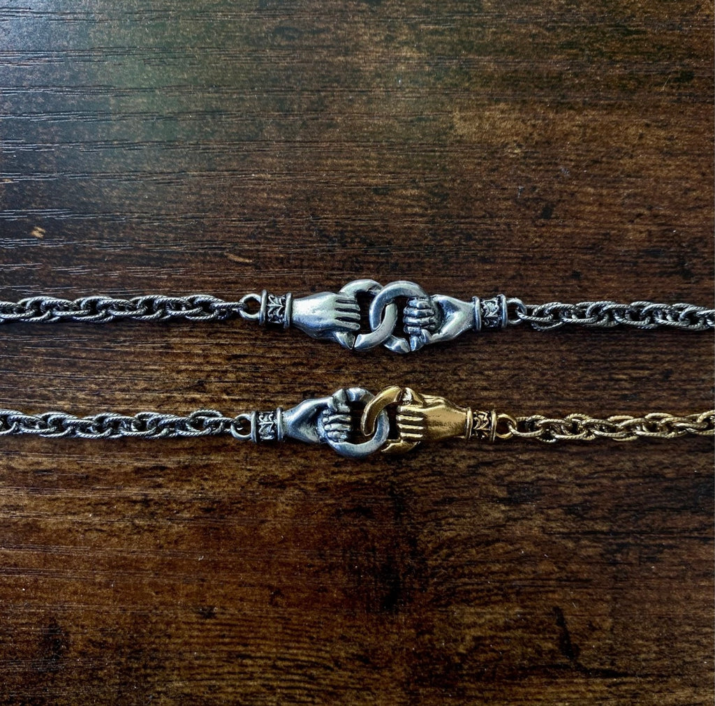 This unique statement bracelet incorporates a mixed metal pendant of two gold plated hands interlocking representing unity and connection. The chain of the bracelet is thick antique silver plate of a very high quality, finished with a gold plated magnetic clasp at the back so you can easily put the bracelet on and take it off. The magnetic clasp also works as an alternate pendant making the bracelet a dual design!
