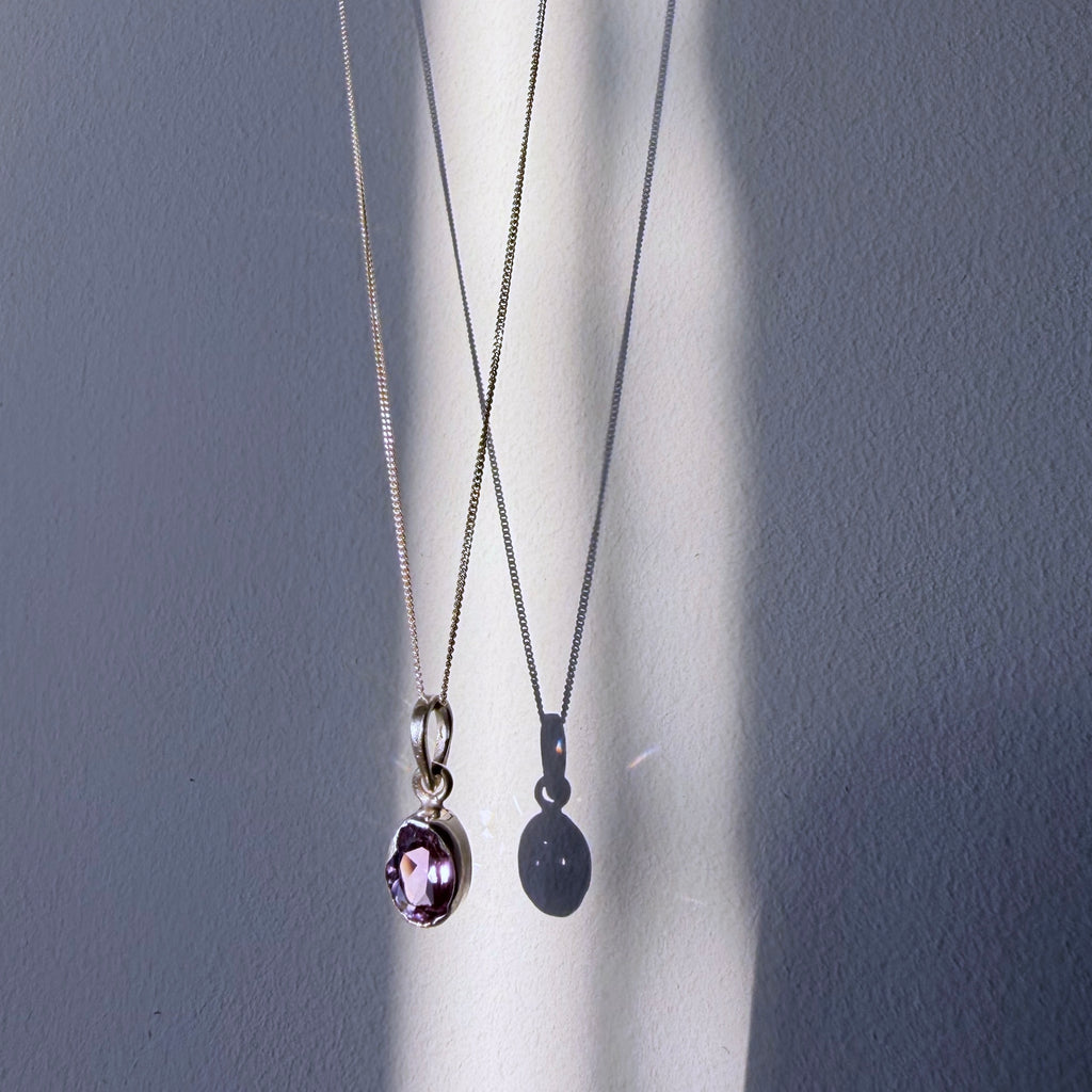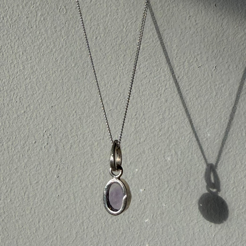At the centre of the pendant sits a single amethyst gemstone. The simplicity of the design allows the natural colour and light of the stone to remain the focus, with the form of the pendant shaped to complement the gemstone.